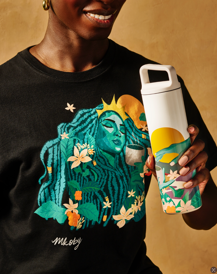 Melissa’s Siren appears as a stunning natural figure, part of the mountainous landscape. Her hair cascades in rows of deep green adorned with flowers, her golden crown shining alongside the sun. The collection includes a t-shirt, stainless steel cold cup, boxed mug set and more, all in Melissa’s signature style. Be sure to take home a piece of this beautiful, limited offering, available exclusively at Starbucks Reserve Roasteries and Stores.